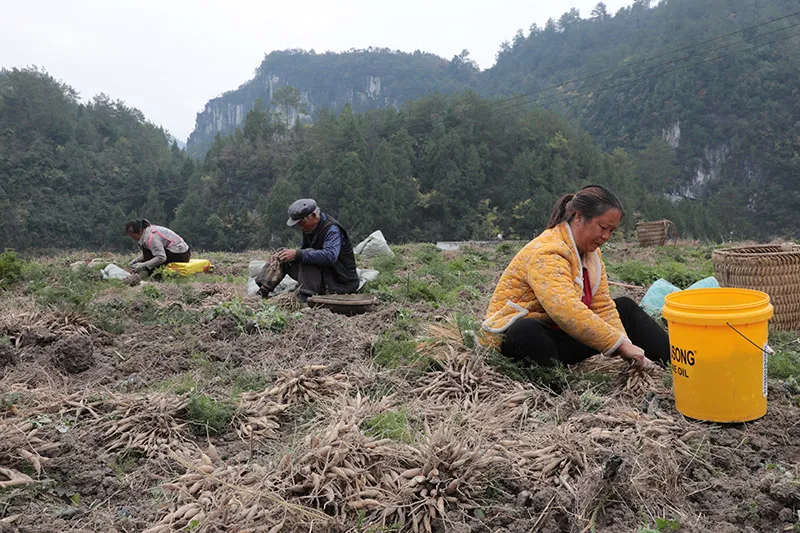 在石阡县河坝镇王坪村,中药材种植户正组织工人采收天冬。黎祖艳摄